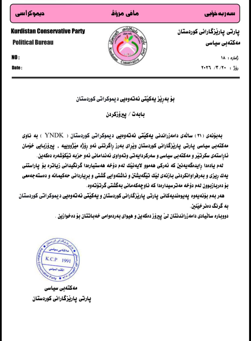 پەیامی پیرۆزبایی مه‌كته‌بى سياسيى پارتى پارێزگارانى كوردستان بۆ (31)ــه‌مين ساڵیادی دامەزراندنی یەكێتی نەتەوەیی دیموكراتی كوردستان YNDK.
