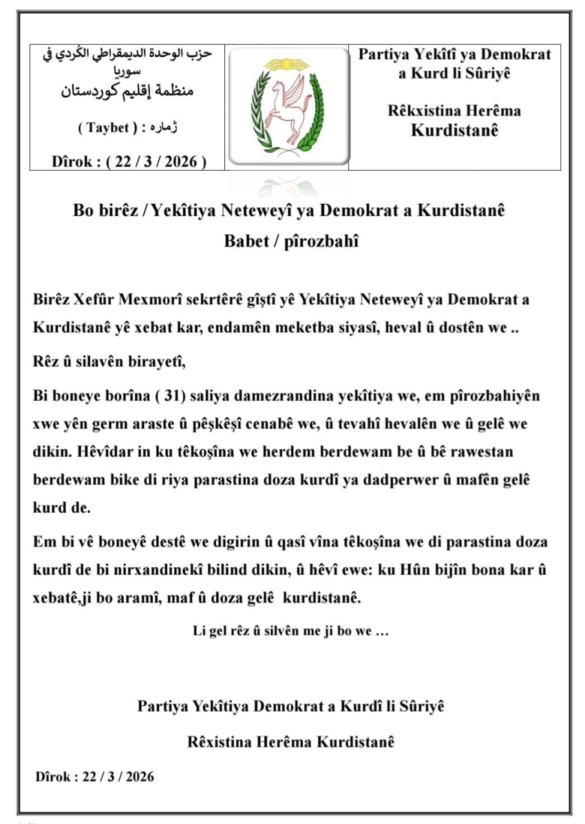 پەیامی پیرۆزبایی پارتی یەکێتی دیموکراتی کورد لە سوریا (یەکێتی ) بۆ (31)ــه‌مين ساڵیادی دامەزراندنی یەكێتی نەتەوەیی دیموكراتی كوردستان YNDK.