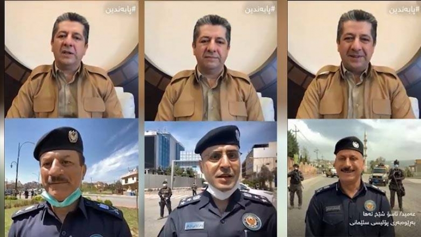 مهسرور بارزانی سهرۆكی حكومهتی كوردستان، ئهمڕۆ 9-4-2020 له رێی پهیوهندی ڤیدیۆییهوه، قسهی لهگهڵ ههریهك له بهڕێوبهرانی پۆلیسی پارێزگاكانی ههولێر، سلێمانی و دهۆك كرد و سوپاس و پێزانینی خۆی بۆ ههوڵ و ماندوبونی هێزهكانی ناوخۆ و پۆلیس دهربڕی.